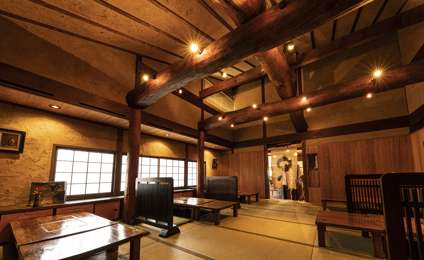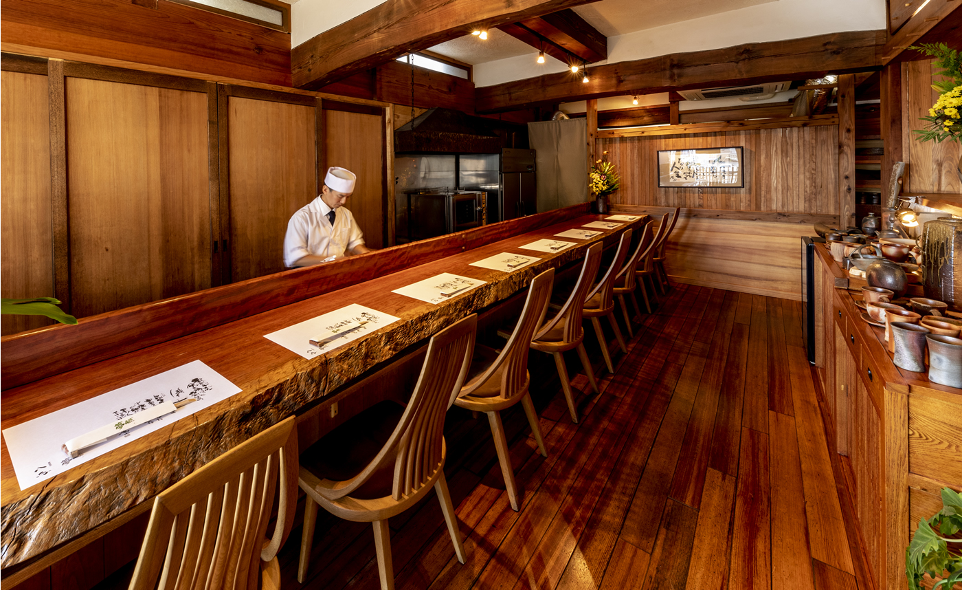 備前焼の器と共に、職人の技と叡智が生み出す至極の料理を提供。米は奥丹波産をはじめ自然の恵みにこだわり、魚や野菜も地域の生産者から厳選。土壁や漆喰、総無垢材を用いた自然素材の空間には、手仕事の温もりと深みが息づいています。